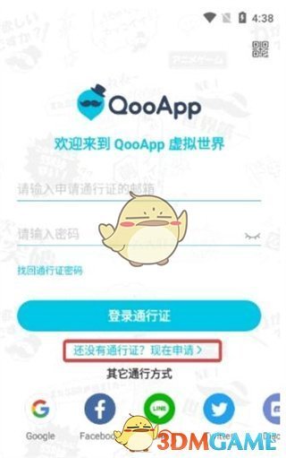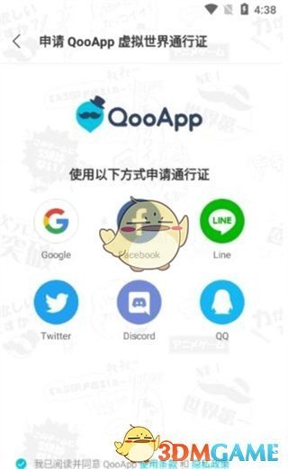 2、然后在申请QooApp虚拟世界通行证的页面中,我们可以选择【Google、Facebook、Line、Twiter、Discord和QQ】等方式来注册;