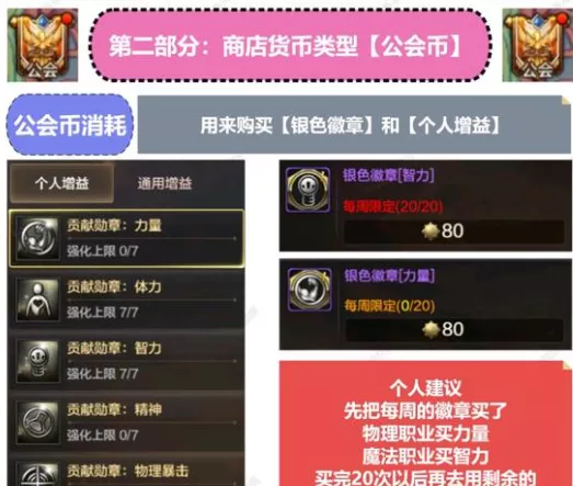 2、公会币:通过签到可以获取,用来购买银色徽章和个人增益