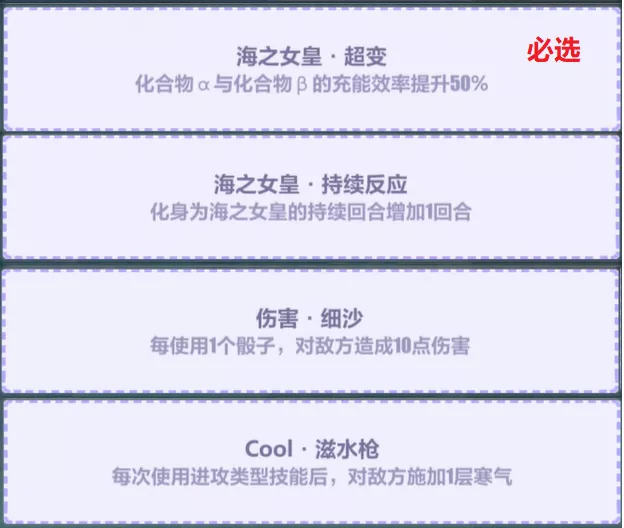 被动技能推荐:海之女皇·超变(必选)、海之女皇·持续反应(推荐)、滋水枪(推荐)、细沙(推荐);