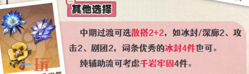 2、其他搭配:中期过渡可以散搭2+2件套,辅助可以用千岩4件套