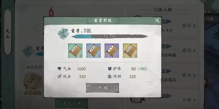 6、门派建议挑选天刀或丐帮,允许攒贡献换武学和轻功,基于自己的发展偏好来挑选即可。