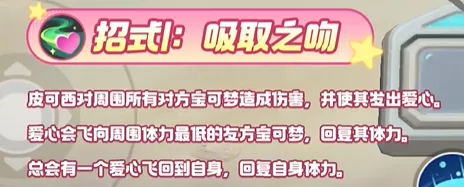 皮可西对周围所有对方宝可梦造成伤害,并使其发出爱心。爱心会飞向周围体力最低的友方宝可梦,回复其体力。