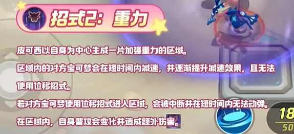 皮可西以自身为中心生成一片加强重力的区域。区域内的对方宝可梦会在短时间内减速,并逐渐增强减速效果,且无法运用位移招式。若对方全可梦运用位移招式进人区域,会被中断并在短时间内无法动弹。