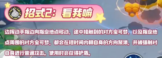 边挥动手指边向指定地点移动,途中接触到的对方宝可梦。以及指定地点周围的对方宝可梦。都会在短时间内朝自身的方向聚集,并被强制对自身进行普通攻击。运用时会获取护盾。