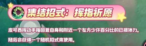 皮可西挥动手指回复自身和附近一个左方少许百分比的已损体力。然后会获取一个随机招式来运用。