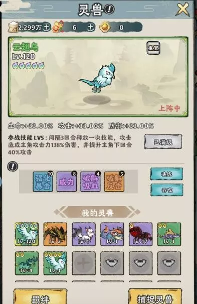 5、灵兽有条件就挑选应龙,(氪佬的挑选,咱这边也不多说了)推荐:还是养绿色鸟(赌狗成分),刷个增加爆伤,强攻,嘎嘎猛一路所向披靡。(我这个鸟是废了。刷鸟以及吞噬的细节就不在这里说了,论坛上搜索就会有,很详细)祝每个修仙者运气爆棚!
