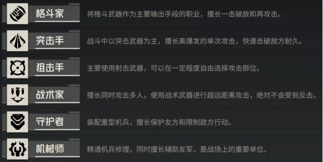 钢岚的机师分为 6 大职业,各个职业的特点和作用如下: