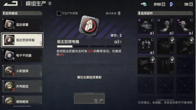 需要注意的是,在解锁车间功能后,模组生产会直接消耗机甲部位。因此,请不要上来就点一通,换一堆模组!应该有序地替换主力紫色或金色机甲套件,随后再转化闲置机甲套件的模组,给主力机甲镶嵌模组。
