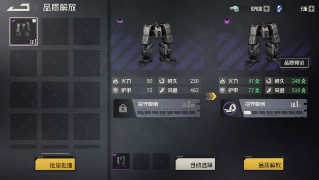 部分同名主力穿戴的机甲,建议先通过品质解放增强其品质,从而增强该部位机甲的属性、解锁模组特效。只要在满品质多余的套件情况下,再去模组生产消耗。
