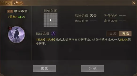 [被动] [突击]造成主动单体兵刃伤害后,对日标领外造成一次68.0%谋略伤害。