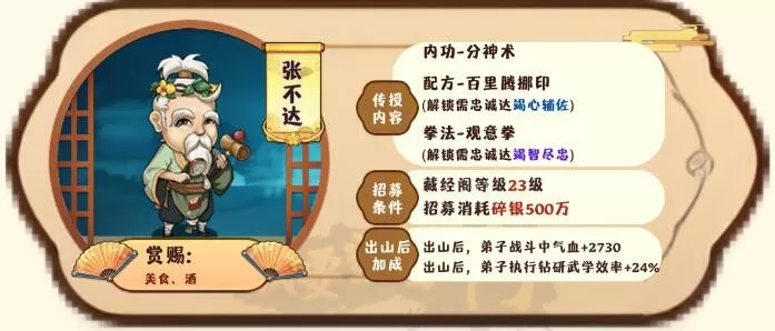 上述是小编带来的《我要当掌门》客卿张不达深度介绍内容,如需更多《我要当掌门》的攻略信息,请点击关注我们,获取更多精彩内容!