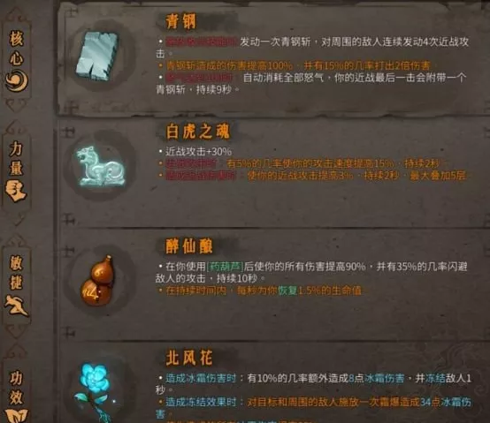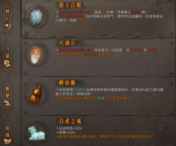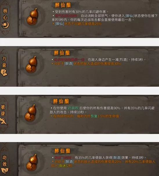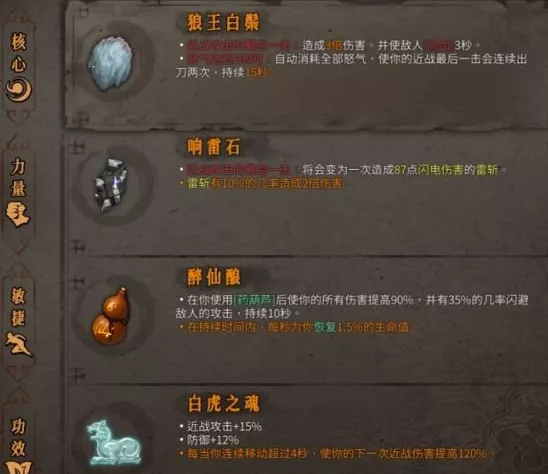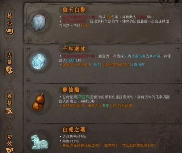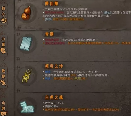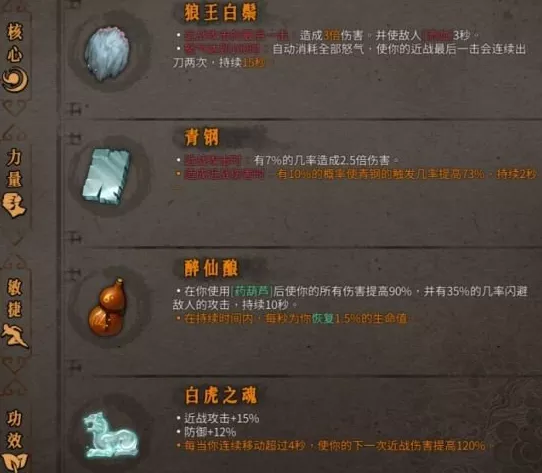 7、下面这套是在没有狼王的情况下的备选,醉仙放1号位主要是提供30%闪避率,并且能更好的触发三刀;青钢也是能换成不相同属性,打BOSS的时候记得把醉仙酿放到3号位喝口药在换回1号位