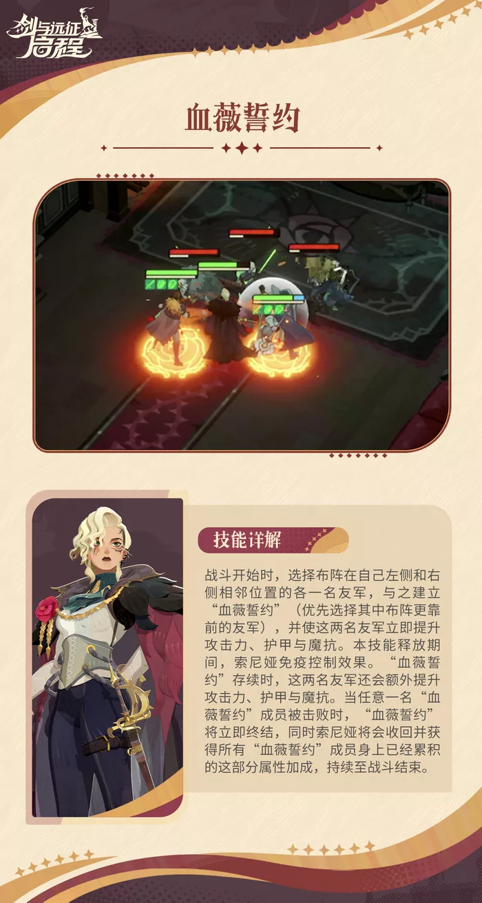 改变索妮娅一技能【血薇誓约】强化机制的核心专属技能,前方也说了被索妮娅一技能强化过的2名角色,其中任何一个角色在死亡后就会失去强化效果,并把这个强化攻击和防御的效果转移到索妮娅身上。