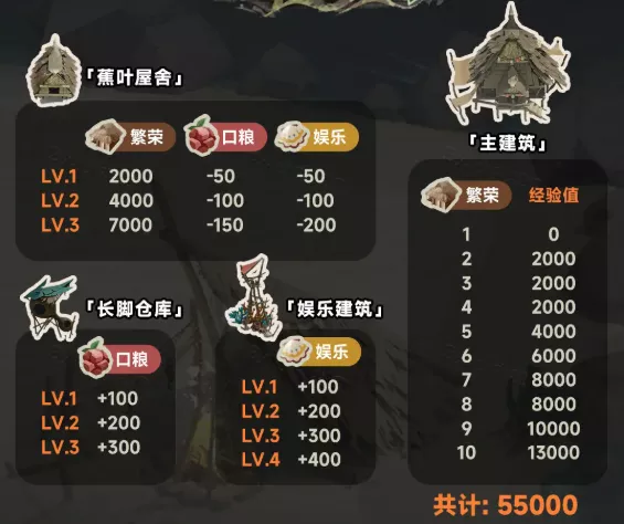 3、蕉叶屋舍的增加,须要消耗回粮值和娱乐值,由长脚仓库和4种娱乐建筑给予。
