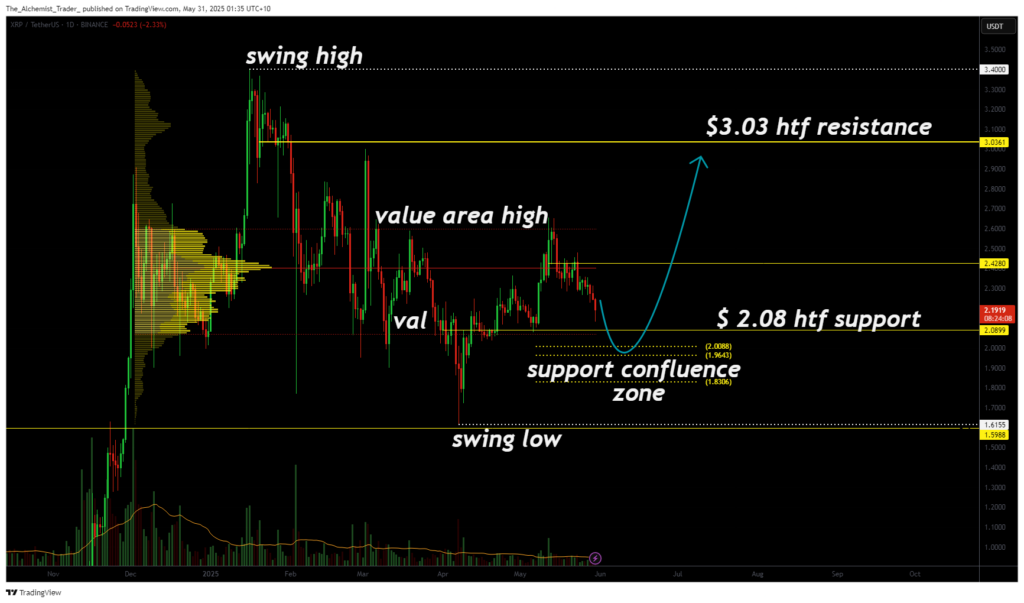 XRP正逼近2美元附近的关键高位时间框架支撑区域。该水平在过去几个月持续充当结构性基础,在多次回调中支撑价格走势。当前价格再次下探该区域,市场对此的反应或将决定XRP是延续整体看涨结构,还是面临更深度的回调风险。