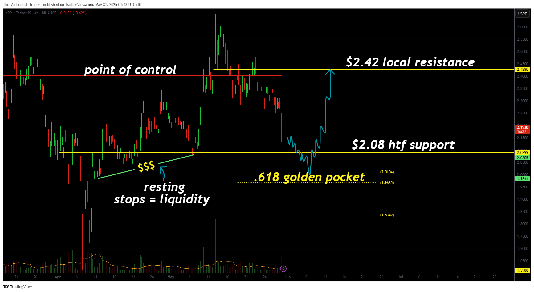 低时间框架价格也呈现重要线索。XRP已形成清晰的高点低点序列,显示交易者将止损设在2美元下方。这类止损单集群可能形成流动性池,做市商常通过扫盘触发反转。若该情景发生,且价值区间低点下方的0.618黄金口袋吸收卖压,强力反弹概率极高。