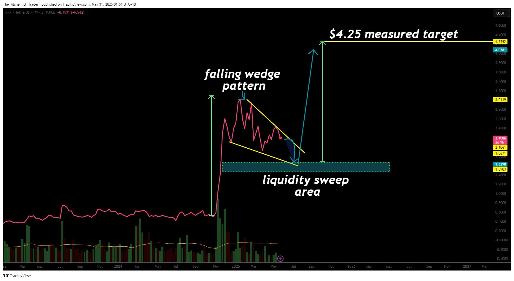 当前多头风险回报比极具吸引力。只要价格守住1.59美元摆动低点并强势收复2美元支撑,看涨结构就依然有效。确认突破下降楔形后,XRP可能先上探2.42美元,继而挑战3美元关口,完整测量目标位看向4.25美元区域。