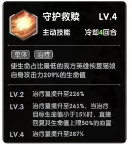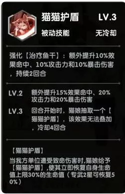 被动:猫猫护盾,4回合造一个猫猫护盾,当我方单位致命伤害时,则立即给其套上,使其恢复自身生命值上限30%的生命值,这非常于多了一条命。同时也给一技能提供了额外的攻击力,暴击伤害,效果命中加成,这属实无解。