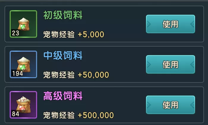 初级饲料只能增加5000宠物经验,中级可增加50000宠物经验,高级饲料可增加500000宠物经验。