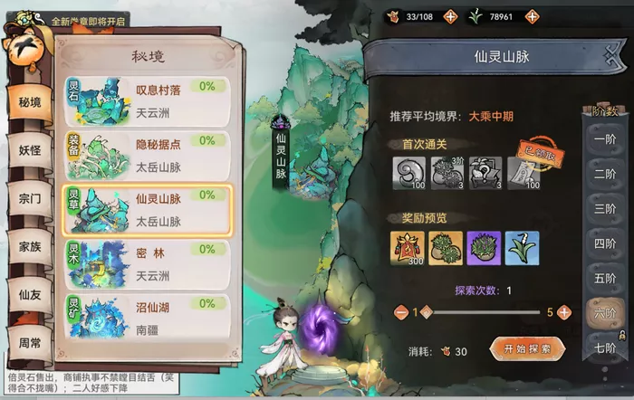到达一定等级后,会在大世界打开仙迹福地的玩法,也就是常说的资源本,分别对应:灵石、装备、灵草、灵木和灵矿这五种资源。
