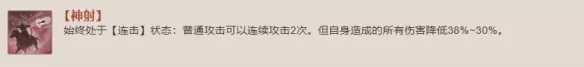 始终处于【连击】状态:普通攻击能够连续攻击2次。但自身造成的所有伤害降低38%~30%。