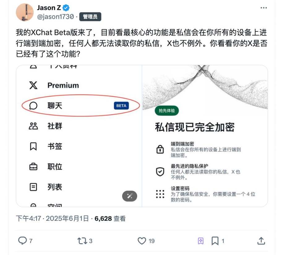 6 月 1 日,马斯克开始发力,宣布 X 平台推出全新讯息系统 XChat,主打端到端加密、消失讯息、任意档案传输和跨平台音视讯通话。