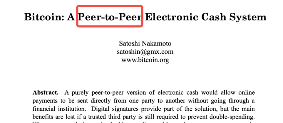 其实十多年前的比特币白皮书标题已经说的很清楚了,「点对点的现金支付系统」,这里的点对点也即经常听到的 P2P。
