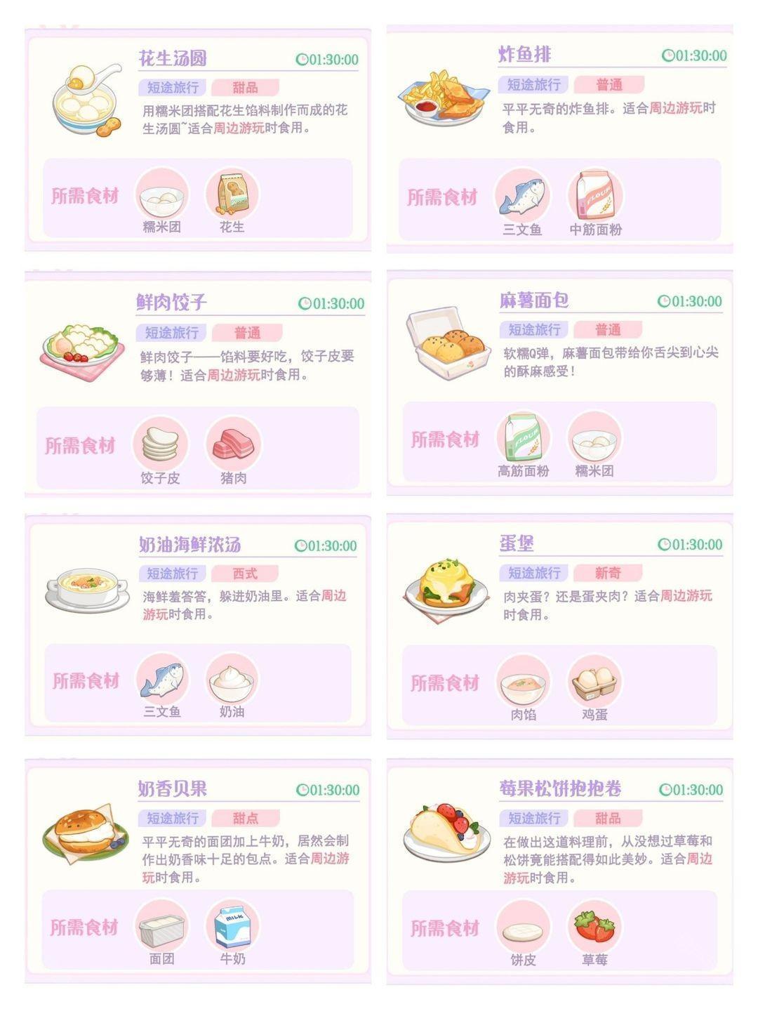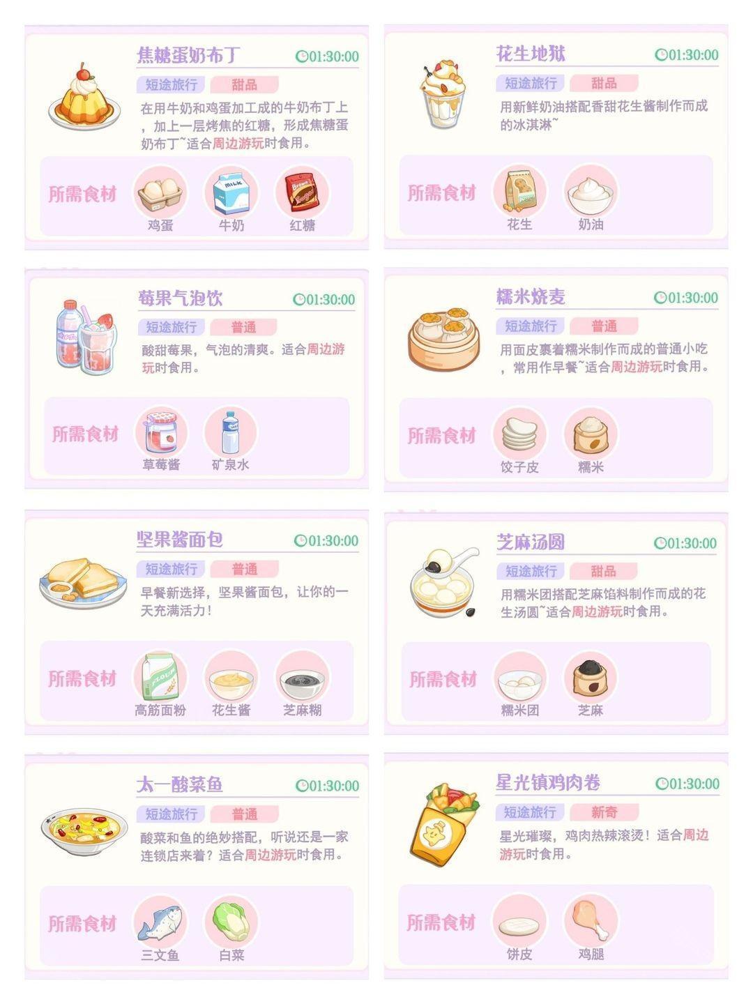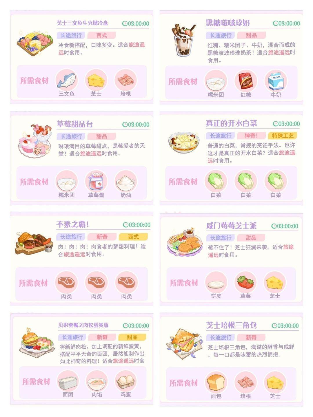 游戏中提供了多种不同的菜谱,包括半成品和完整料理。半成品是指不能直接携带,需要二次加工的食物;而完整料理则可以给角色带上。需要注意的是,烹饪一次可能需要数小时,并且某些食材会用到半成品。