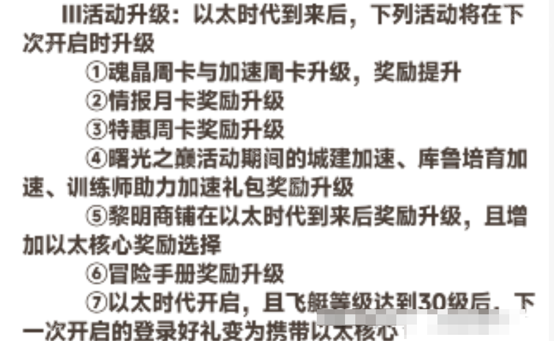 一大部分活动(周卡、月卡、冒险手册、隐秘登陆奖励等)奖励进行了升级,新增奖励以太核心。