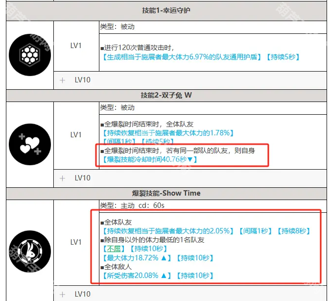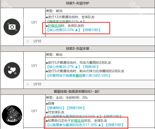 娜嘉(黑JK):负责提供全队核心伤害加成并提供攻击力(需注意:自身要有护盾才能触发大BUFF效果),并提供一定的奶量