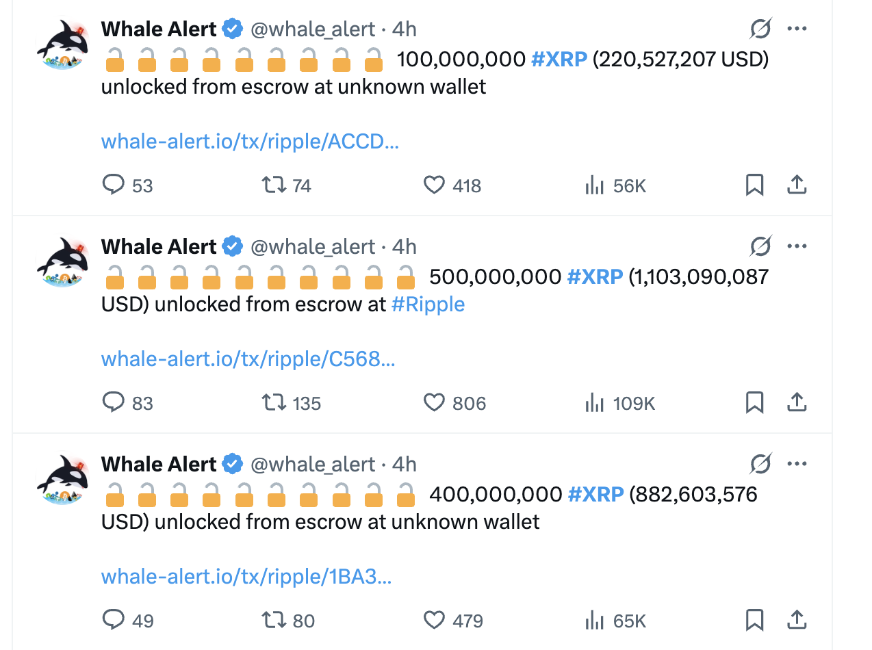 加密货币追踪服务Whale Alert标记了Ripple的最新托管活动。根据X平台的一系列帖子,Ripple通过三笔独立交易释放了这10亿枚XRP。