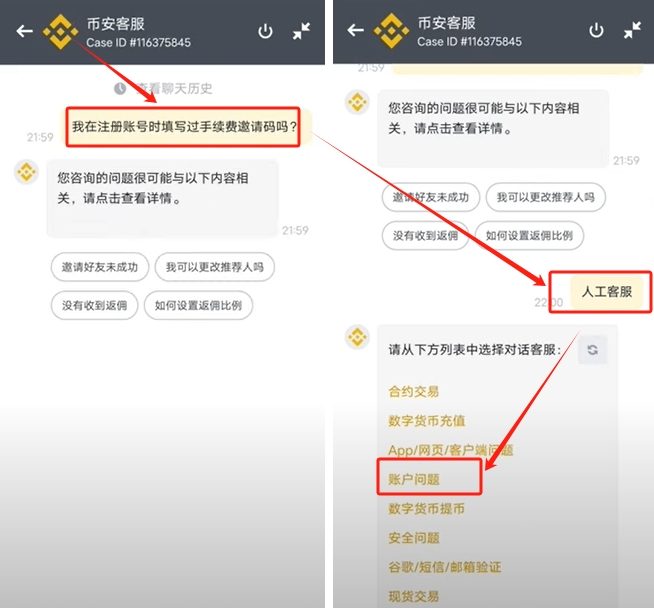 2.在聊天框内询问客服我们在注册账号的时候有没有填写过手续费优惠的邀请码。这时会有一个机器人的回复。我们需要跟他讲要“人工客服”。选择客服类别,我们要咨询的是交易问题、提币问题还是买币问题。点击“账户问题”,因为到底有没有手续费的优惠,其实是账户的性质。