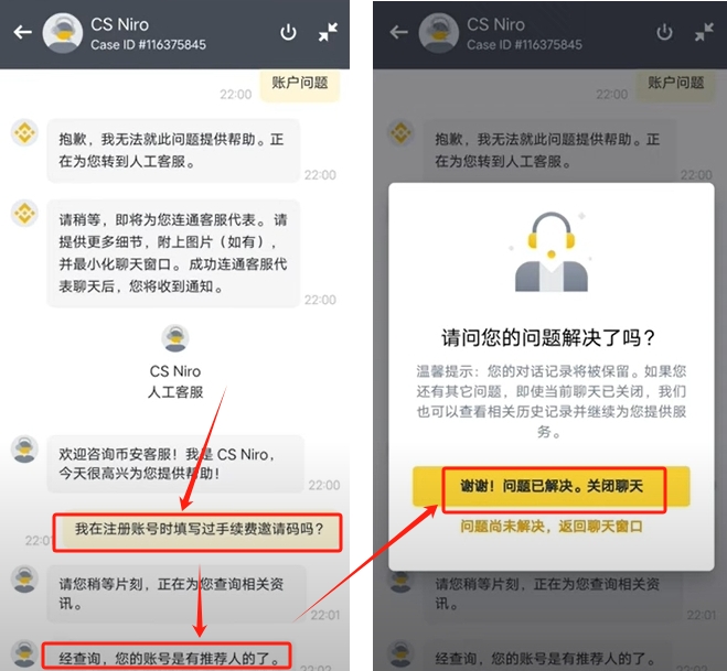 3.接入人工客服之后,再问他一次,我们的账户在注册的时候有没有填写过手续费优惠的邀请码。它会帮我们进行查询,告诉我账号是有推荐人的。意思就是说我们在注册的时候,已经填写过手续费优惠的推荐码了。如果我们有返佣关系,就不需要重新注册了。如果没有,他会告诉你的账户没有绑定返佣关系。返回结束聊天。
