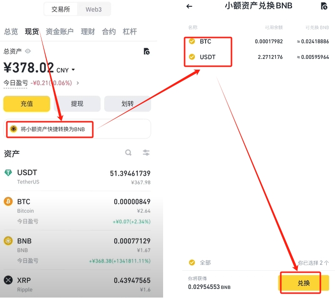 2.我现在所有的钱都在现货账户里面,点击“将小额资产快捷兑换为BNB”,就能把卖不掉的碎币都兑换成BNB。全选(除了USDT),点击【闪兑】