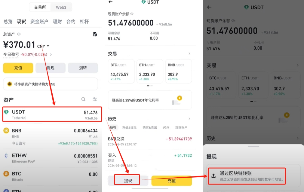 点击现货账户里面的USDT,选择左下方的【提现】按钮。选择【通过区块链转账】