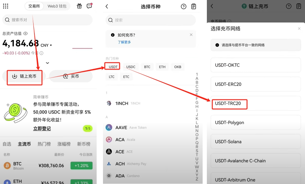 4.打开欧易交易所,点击【链上充币】,币种选择USDT,网络选择USDT-TRC20。
