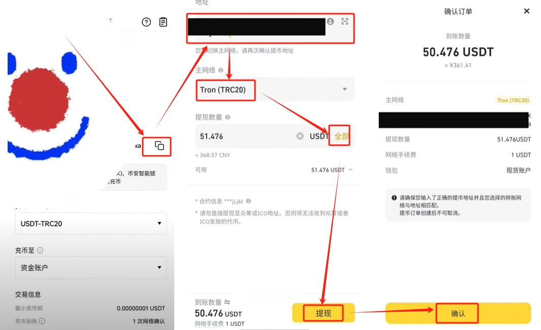 5.复制地址,返回币安交易所。粘贴上地址,网络还是选择TRC20,全部数量,点击【提现】。确认之后再输入一下验证码,就能够把USDT提到欧易交易所了。我们在注销老账户的时候,这里面就不能留钱了。