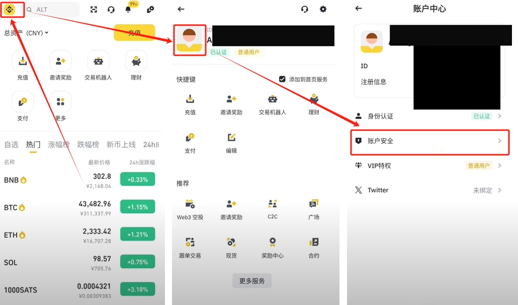 6.点击币安首页左上角的币安图标,点击头像。选择【账户安全】。