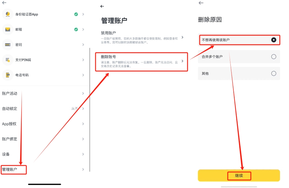 8.下滑页面找到【管理账户】,选择【删除账号】。这里一定要注意,一旦删除账号之后,对应的你的身份证号,邮箱和手机号也就都释放掉了。老手机号,老身份再注册一个新的币安账号也是可以的。选择产出原因,点击【继续】,删除账户就可以了。