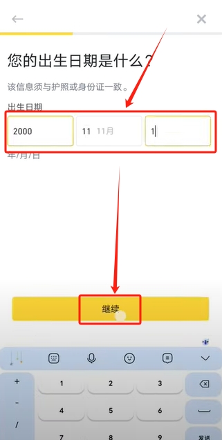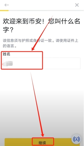 接下来要输入一个身份证名字,或者说你用护照注册,就使用护照上面的名字。这个一定要是真实的,是你真实证件上方的名字,胡乱写填写一个既通过不了认证,也是对你自己资产的不负责任,输入名字,点击下方的【继续】。