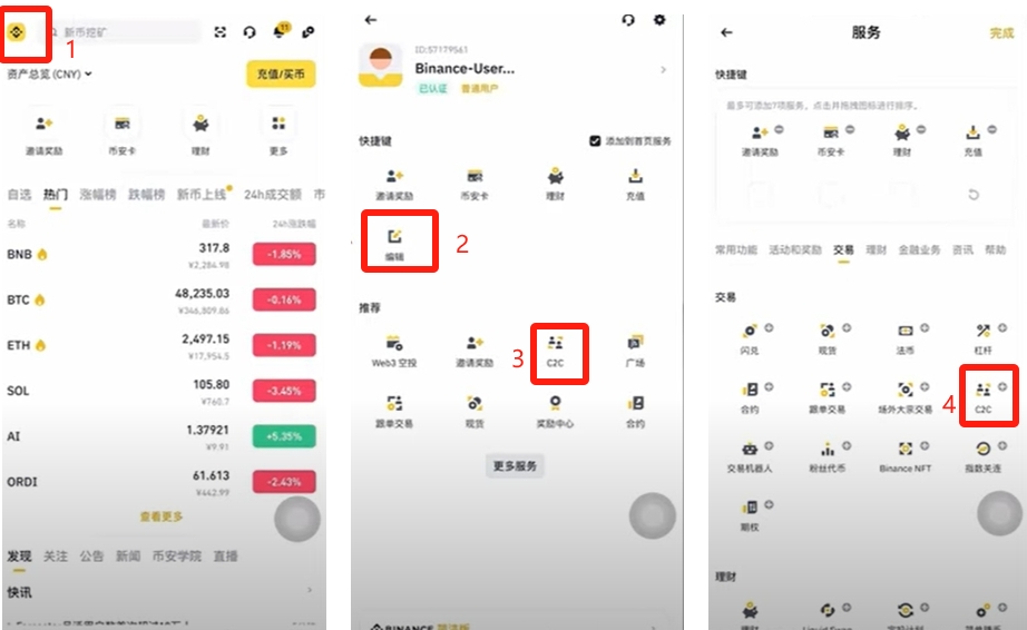 C2C交易:在“推荐”这里有一个C2C,如果我们想把它添加到快捷键里也是很简单的。我们可以点快捷键上面的“编辑”找到C2C,点击C2C右上角的小+号,就把他添加到我们上方的快捷键里了。