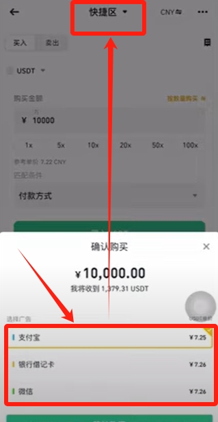 这时他会让你选择使用支付宝或者说银行卡来进行购买。我们先不要点击确认购买,因为这里它是快捷区。大家可以看到上方他有快捷区的标志,快捷区是系统自动给你匹配商家来与你进行交易,我们没有办法自己挑选商家,我们并不知道这个商家是否安全。在这方面我们是可以通过一些小细节来筛选一些商家的。