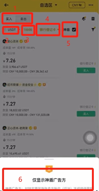 我们点击上方的“快捷区”,切换到自选区里面。自选区我们可以更加好的进行筛选。在这里依旧有买入以及卖出两个选项,接下来的一行选择数字货币USDT。筛选我们的金额,比如说我们筛选个1万,点击【确认】。筛选支付方式,比如说我们选择银行卡。后方还有一个神盾的选项,我们可以把它勾选上,下方提示“仅显示神盾广告方”,它的意思就是,对特定原因导致卖方账户司法冻结提供限额的赔付。这些神盾商家都是在币安平台交了10万美金押金的,比如说你从他这里买币或者卖币被冻结了,也是有一定的赔付额度的。因为有这个押金的存在,相对应这些商家的冻卡风险也会小一点。