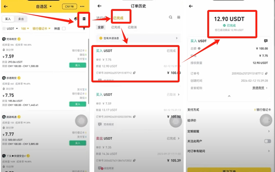 如果你像我刚才一样, 不知道点到哪里把订单点出来了,你可以在这里右上角点击历史交易的小图标。来看我们刚刚已完成这一笔订单,现在他已经显示我们购买的12.9个USDT已经到成了。