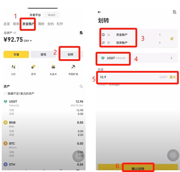 我们返回主页,点击右下角的【资金】,点击我们的资金账户。可以看到12.9个USDT已经在这里了,可能大家会纳闷,为什么这里显示的是92.75块的人民币,我们刚才买的明明是100块?因为我们买的数量实在是太少了,这个兑换的单价比例是很高的。如果你的交易量大了,价格就下来了。USDT它是一个稳定币,他的价格是跟美元1:1挂钩的。对于你买的特别少的时候,它可能会有一点点的溢价,但是差别不是很大。它作为稳定币来说,不会类似于比特币、狗狗币这样它的波动非常大。