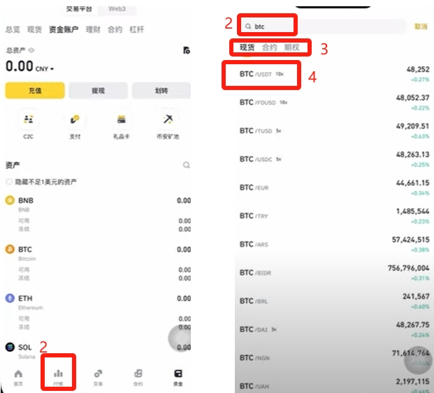 现在我们就可以去进行交易了。我们在下方的导航栏找着行情,可以在上面直接进行搜索你想买的币,比如说我们用比特币来给大家演示一下,我们直接在这里搜索BTC,上面他会有三个选项,现货、合约、期权,每一个下面对应的都是不同的玩法,我们选择现货。新手我们先把现货玩明白就可以了。我们买的USDT,所以我们就要选择第一个“BTC/USDT”的交易对。你不要管它后面写的是10X还是几X,我们点击进去,我来教你正确的购买。