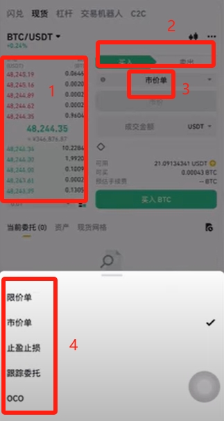 来到交易页面,左边是他的交易池,有多少人挂卖单都在这里看的到,右边这里有买入和卖出,我们现在是用USDT买比特币,就选择“买入”,再往下一行他这里显示市价单,点击小箭头可以看到限价单、市价单、止盈止损、跟踪委托、OCO好几个选项,我们新手就用限价单和市价单这两个就可以了。