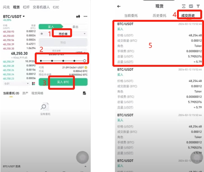 如果你比较着急的话,我们可以切换为市价单进行购买。市价就是按市场最优价格购买,你只需要选择你要购买的USDT的数量就可以了。比如说我们拉满,点击【买入USDT】。我们可以点击“历史委托”,在上方“历史成交”里看到我们刚才买的比特币。