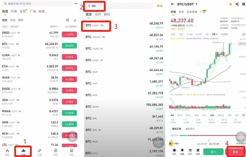 我们如果想卖出USDT的话,还是和刚才一样,我们点击“行情”,还是选择“BTC/USDT”的交易对,你可以在上面搜索BTC,然后点击【卖出】。