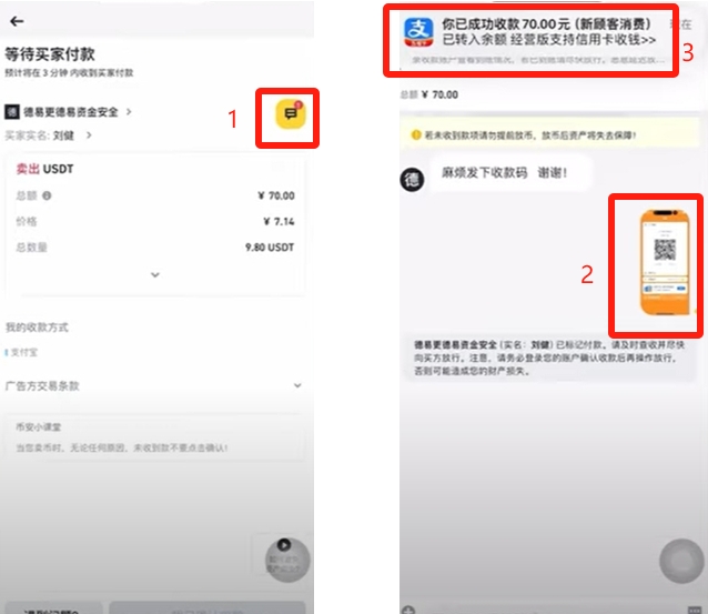 接下来我们稍等一会,要个对方给我们转账过来的时间,我们可以点击聊天框看他给我们说什么,他让我们出示收款码。我们把收款码给他发过去,稍等一下他给我们一个转账过来的时间。可以看到上方显示我们的支付宝已经收款到了70元。
